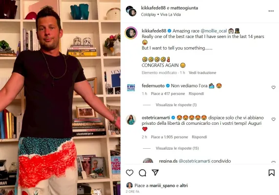 Federica Pellegrini è in dolce attesa. L’ex nuotatrice, dopo i dubbi sollevati dai paparazzi di Chi, che l’avevano immortalata con un pancino decisamente sospetto, conferma l’indiscrezione con un video pubblicato su Instagram. Eccola danzare davanti alla videocamera del cellulare e sollevarsi la camicia a fiori per mostrare il pancino con su scritto: "We'll take it back!", "ce lo riprenderemo". Il riferimento è al record appena raggiunto nei 200 stile libero da Mollie O'Callaghan, un record che dopo 14 anni fa crollare quello della Divina. Che con l'ironia e la competitività che l'hanno sempre contraddistinta si congratula con la nuotatrice australiana ma allo stesso tempo le fa sentire già il fiato sul collo. Gli indizi lanciati sui social, a dire il vero, sono stati tanti, e forse Federica si è anche un poco divertita a tenere tutti sulle spine. Pochi giorni fa, sempre sui Social, aveva pubblicato una storia con un biglietto per suo marito Matteo Giunta: “Amori miei, buongiorno. Torno presto”, e accanto una tazzina di caffè e una emoji di un cuore. Quel plurale non era messo lì evidentemente per caso…