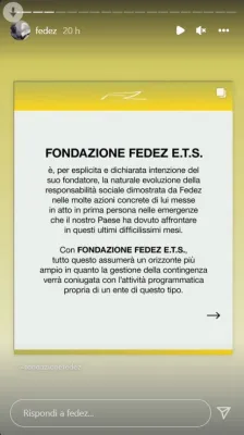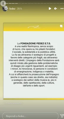 Così Fedez sulle sue storie di Instagram presenta ufficialmente la sua fondazione che opererà su tre pilastri, scrive il rapper: ''Il sociale, la solidarietà e la pubblica utilità'', ed è il progetto, continua Fedez, ''a cui voglio dedicare le mie energie per il futuro.