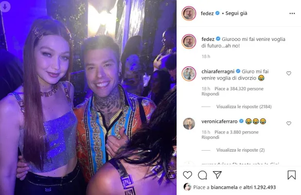 Chiara famosa per la sua gelosia nei confronti del marito ha prontamente commentato pungente: “Giuro mi fai venire voglia di divorzio“, aggiungendo poi una faccina che ride.