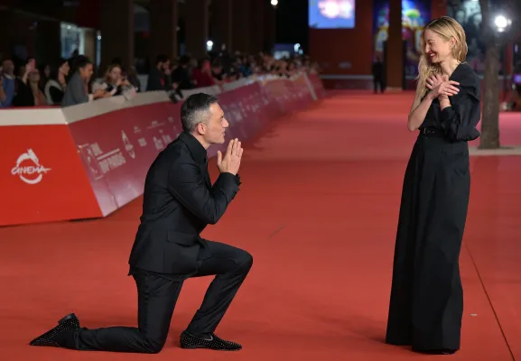 Vincono in simpatia Alba Rohrwacher e Filippo Timi, per nulla ingessati. L'attore italiano si inginocchia davanti alla sua compagna di set nel film Mi fanno male i capelli di Roberta Torre. Poi la prende in braccio. Insomma, presenza esplosiva!