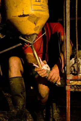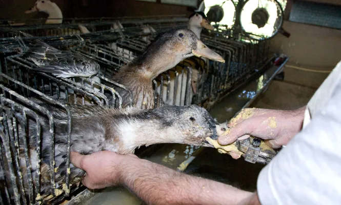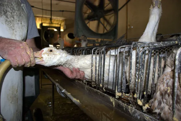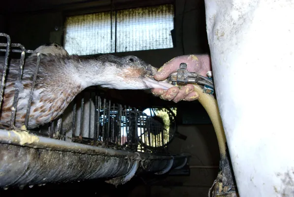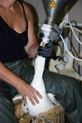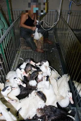 Nel capannone ha inizio l’alimentazione forzata. L’inchiesta ha documentato quella degli allevamenti francesi, con le anatre ingozzate 2 volte al giorno per 15 giorni con una razione di circa 500 gr di un pastone di mais cotto e acqua. Durante l’intero processo ogni anatra può arrivare ad ingerire sino a 10 kg di mangime e il suo peso può aumentare anche di 3 kg.