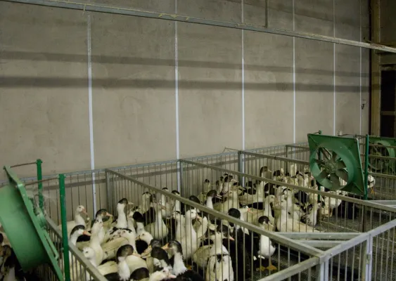 L’uso delle gabbie è una costante negli allevamenti che producono foie gras, come anguste gabbie individuali, vietate dalla legislazione europea, con gli animali impossibilitati ad aprire le ali o a girare su se stessi.