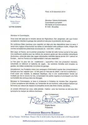 Brigitte Bardot, icona del cinema francese, odia il foie gras, il fegato ingrossato di oche e anatre sottoposte ad alimentazione forzata con un tubo infilato nell’esofago. Con la sua fondazione, la Fondation Brigitte Bardot per i diritti degli animali, porta avanti la sua battaglia da anni, come quando il 23 dicembre del 2004 scrisse al lituano Vytenis Povilas Andriukaitis, commissario europeo per la salute e la sicurezza alimentare della Commissione Juncker, ricordandogli l’importanza di proibire l’alimentazione forzata di oche e anatre per la produzione di foie gras e di estendere a livello comuntario il divieto di una “pratica crudele, indegna di standard europei” fatta di “sofferenza estrema”, “metodi meccanici dolorosi”, con le femmine “schiacciate o gasate” e “i maschi condannati alla tortura di un’alimentazione forzata”.