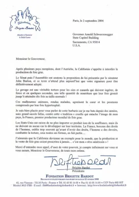 Brigitte Bardot, icona del cinema francese, odia il foie gras, il fegato ingrossato di oche e anatre sottoposte ad alimentazione forzata con un tubo infilato nell’esofago. Con la sua fondazione, la Fondation Brigitte Bardot per i diritti degli animali, porta avanti la sua battaglia da anni, come quando il 2 settembre 2004 scrisse all’allora governatore della California, l’ex attore Arnold Schwarzenegger, chiedendogli di avallare, cosa poi avvenuta, un disegno di legge del senatore John Burton contro il foie gras: “Mi trovo nella posizione di poter parlare di questa barbarie perché combatto da anni, senza grande successo, ahimè, contro questa tradizione crudele che appanna l’immagine del mio paese, la Francia, il principale produttore mondiale di foie gras”. Poco prima nella sua lettera aveva denunciato le condizioni di animali infelici, fatti ammalare a forza di essere ingozzati, con il cuore agonizzante e i polmoni compressi dal fegato ormai ipertrofico.