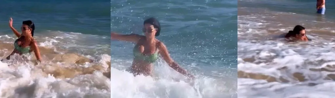A chi non è capitata l’avventura estiva di essere travolto dalle onde e finire sulla battigia in modo scomposto, con i capelli pieni di sabbia e magari con il costume fuori posto? Ne sa qualcosa Georgina Rodriguez che in una spiaggia del Portogallo dove si trovava in vacanza con i figli è stata trascinata dai flutti dimostrando però di divertirsi un mondo. Fra l’altro ha avuto la fortuna che il bikini, già succinto, sia rimasto al suo posto fra le generose curve del suo corpo.