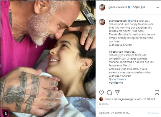 Gianluca Vacchi è diventato papà di una bambina e ha comunicato il lieto evento con una post campione di like sui suoi social. La foto ritrae il 53enne insieme alla compagna Sharon Fonseca: nello scatto si intravedono la testa e la manina della neonata mentre le parole che accompagnano il post sono in inglese e in spagnolo: «Lei è con noi... Sharon ed io siamo felici di annunciare che questa mattina è nata nostra figlia, Blu Jerusalema Vacchi. Grazie a Dio è sana e la stiamo già amando più delle nostre vite».