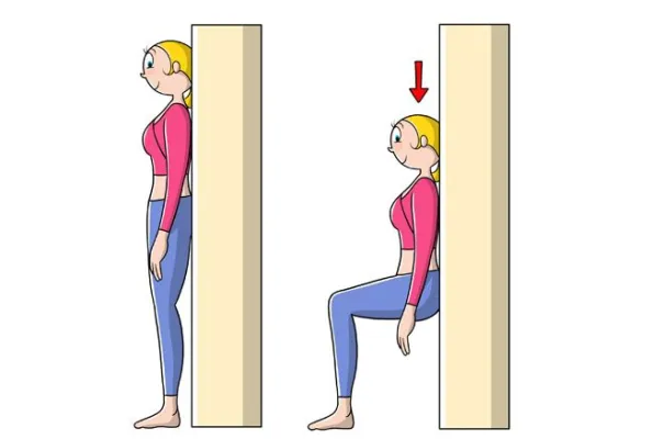 (www.melarossa.it) Potenziamento delle gambe: In piedi, appoggia la schiena al muro e porta i piedi a 20 cm di distanza. Scivola lentamente con la schiena finchè le gambe non sono piegate a 90 gradi. Tieni la posizione per 20 secondi. Ripetizioni: 5 volte. Illustrazione: Marcello Carriero