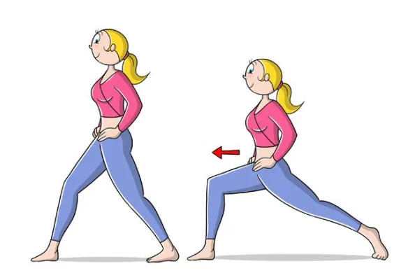 (www.melarossa.it) Affondi: In piedi, gamba destra spostata in avanti, mani sui fianchi. Piega la gamba destra mantenendo la schiena dritta e torna alla posizione di partenza. Ripetizioni: 20 volte per ogni gamba. Illustrazione: Marcello Carriero