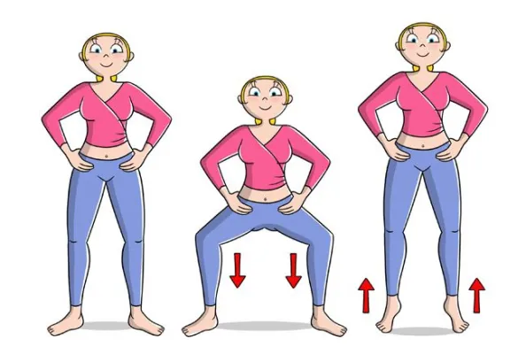 (www.melarossa.it) Squat: In piedi, gambe aperte alla stessa larghezza del bacino e mani sui fianchi, piega le gambe a 90 gradi, pancia in dentro, e risali. Per chi è allenato: quando risali, contrai i glutei e sali sulla punta dei piedi. Pancia in dentro, cerca di allungare il collo come se un filo ti tirasse verso l'altro. Tieni la posizione per 10 secondi. Ripetizioni: 20 volte. Ilustrazione: Marcello Carriero
