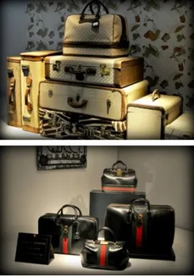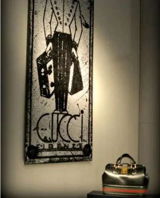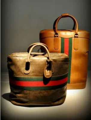 ?G. Gucci Travelling Goods Florence sono le parole che compaiono sulle prime etichette di valigie e bauli realizzati a Firenze. Il marchio in inglese, sottolinea la visione internazionale del fondatore che si rivolge ai moderni viaggiatori dell?epoca di tutto il mondo. Articoli d?impeccabile fattura e qualità, capolavori di finissimo artigianato, già simbolo di uno stile disinvolto e dinamico. Oggetti che continuano a rappresentare, ieri come oggi, un modo inconfondibile di esplorare il mondo attraversando aeroporti internazionali, su barche da sogno o quattro ruote fiammanti, verso metropoli affollate e mete del jet-set.