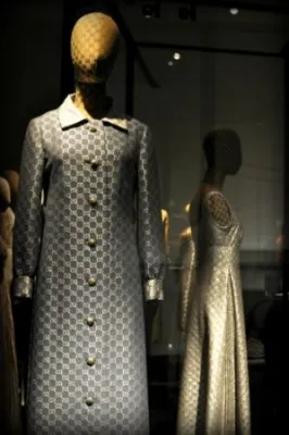 Soprabito, tessuto lamè "original GG", primi anni Settanta. Ispirata alle iniziali del fondatore della Maison Guccio Gucci, l'iconica doppia G intrecciata comparve per la prima volta negli anni Sessanta sulle fibbie delle borse. Nel corso degli anni, il logo venne continuamente reinterpretato: placcato in oro o argento, impresso in rilievo su pelle o intrecciato in tessuti pregiati. Oggi, rappresenta il legame tra il patrimonio della Maison e il suo futuro, conferendo fascino a pezzi classici come i foulard di seta, le borse, così come a oggetti innovativi come le custodie per computer e per iPad.