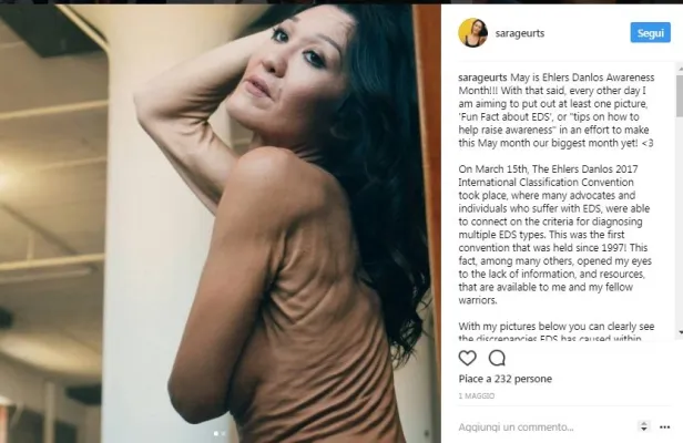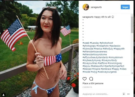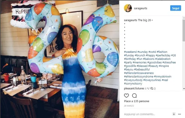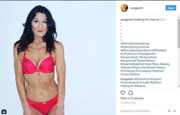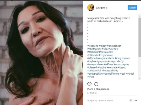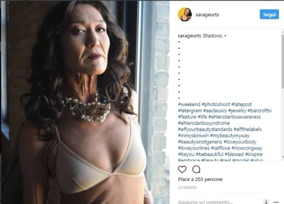 Sara Geurts ha solo 26 anni ma guardando le sue foto verrebbe da pensare ad una donna di 40 o 50 anni. E' affetta da una malattia genetica rara conosciuta come sindrome di Ehlers-Danlos che colpisce il collagene, provocando lassià dei legamenti e iperelasticità della cute.
