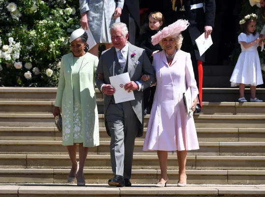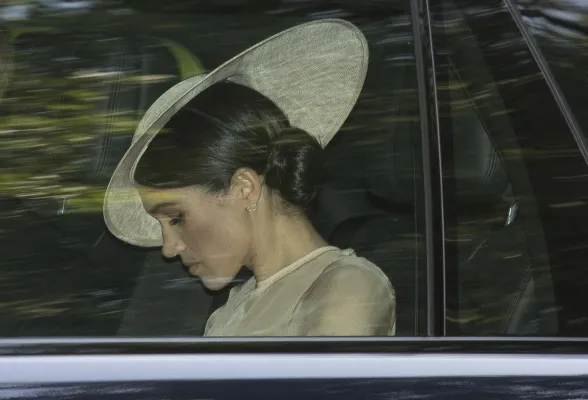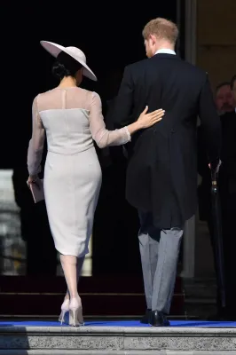 Meghan si è fatta notare in un elegante abito firmato Goat, e con cappello di Philip Treacy, dopo aver indossato tre giorni fa al matrimonio nel castello di Windsor l'ammiratissimo vestito da sposa disegnato da Clare Waight Keller (stilista britannica salita di recente al timone di Givenchy) e al successivo ricevimento una creazione di Stella McCartney.
