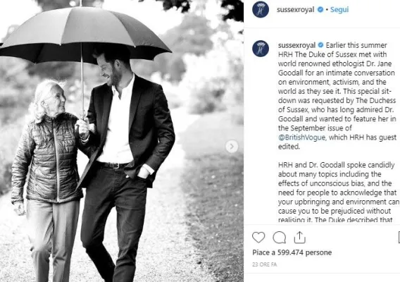 Il principe Harry e la sua consorte Meghan, che a maggio ha dato alla luce il piccolo Archie, non prevedono di avere in tutto più di due figli. Lo ha detto a sorpresa lo stesso duca di Sussex, intervistato dalla famosa primatologa e ambientalista Jane Goodall (nella seconda e terza foto con il principe Harry) per il numero di settembre di Vogue Uk: un'edizione speciale affidata come direttore ospite proprio a Meghan Markle e dedicata in particolare ad esaltare le figure di donne simbolo del "cambiamento", tutte d'ispirazione liberal.