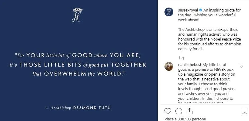 Harry e Meghan nei giorni scorsi avevano postato sul loro account Instagram una frase dell'arcivescovo Desmond Tutu che ha mandato su tutte le furie molti utenti della rete: "Fai il tuo pezzettino di bene dove sei; sono quei piccoli pezzi di bene messi insieme che cambiano il mondo". In risposta, riporta il britannico Sun, qualcuno ha scritto: se la coppia "la smettesse di usare jet privati" anche questo "aiuterebbe il mondo". Mentre un altro utente è stato meno diplomatico: "Avete finito con il vostro jet-set e le vostre ipocrisie?".