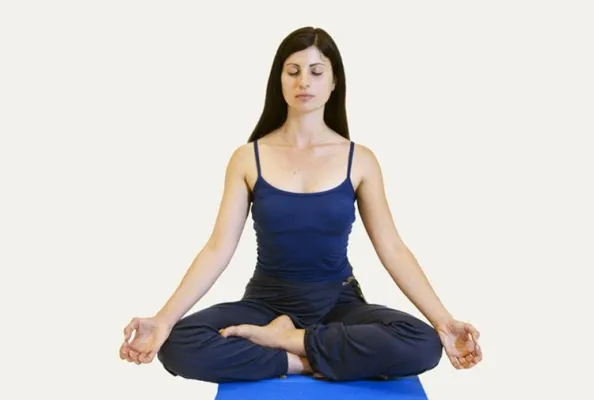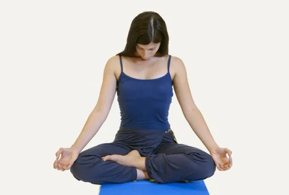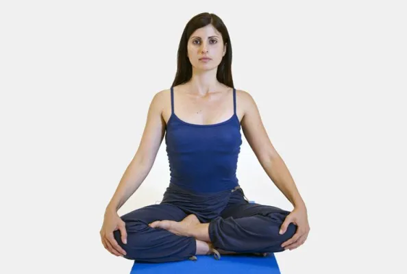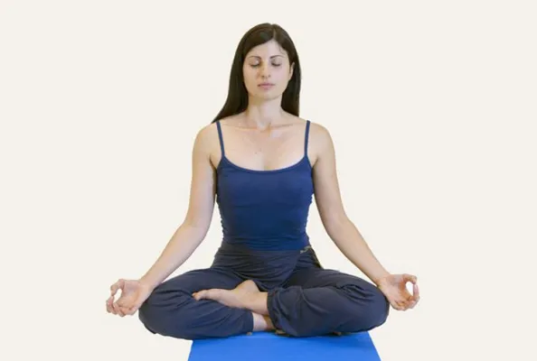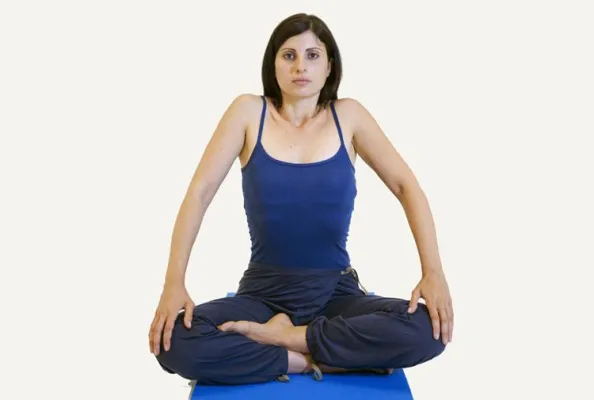 (www.melarossa.it) Respirazione yoga completa, fase addominale mani su pancia: Siediti in una posizione comoda a gambe incrociate a tua scelta (posizione semplice, del mezzo loto o del loto), la schiena dritta. Le mani sull'addome, inspira finché senti che l'addome si espande e le dita si allontanano, espira in modo che l'addome si abbassi e le dita si avvicinino nuovamente. Esegui per 2 o 3 volte, con l'ausilio delle mani. Copyright: Shutterstock.com