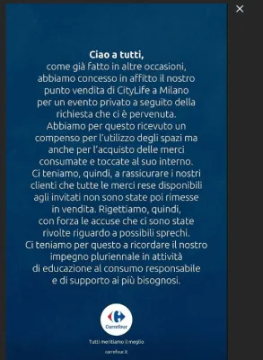 Ed ecco invece il comunicato del supermercato Carrefour: “come già fatto in altre occasioni, abbiamo concesso in affitto il nostro punto vendita di CityLife a Milano per un evento privato a seguito della richiesta che ci è pervenuta. Abbiamo per questo ricevuto un compenso per l’utilizzo degli spazi ma anche per l’acquisto delle merci consumate e toccate al suo interno. Ci teniamo quindi a rassicurare i nostri clienti che tutte le merci rese disponibili agli invitati non sono state poi rimesse in vendita. Rigettiamo quindi con forza le accuse che ci sono state rivolte riguardo a possibili sprechi. Ci teniamo per questo a ricordare il nostro impegno pluriennale in attività di educazione al consumo responsabile e di supporto ai più bisognosi”.