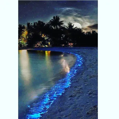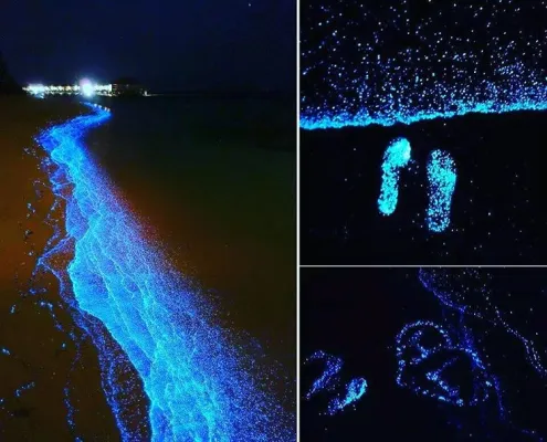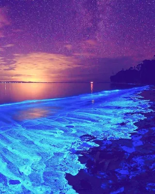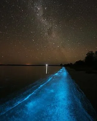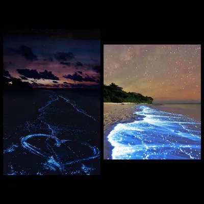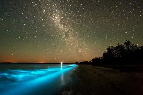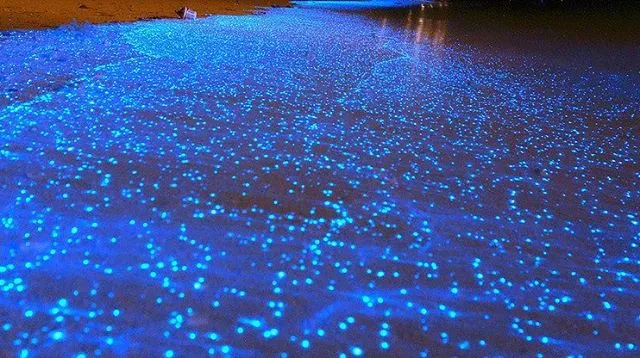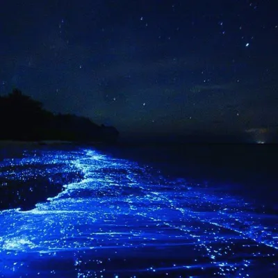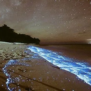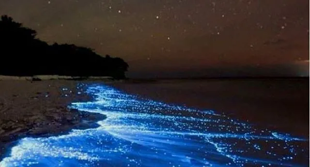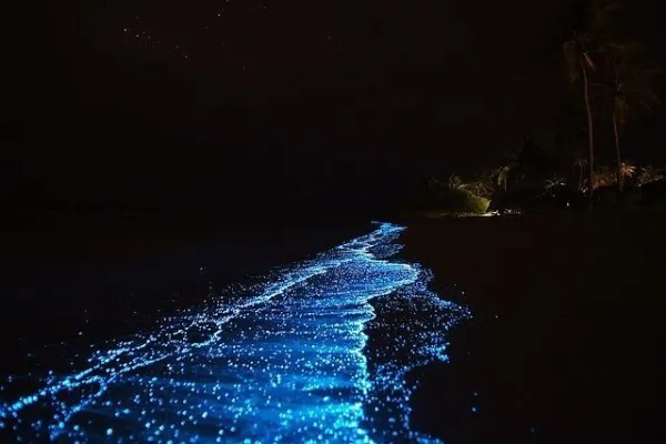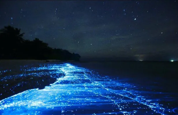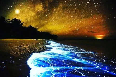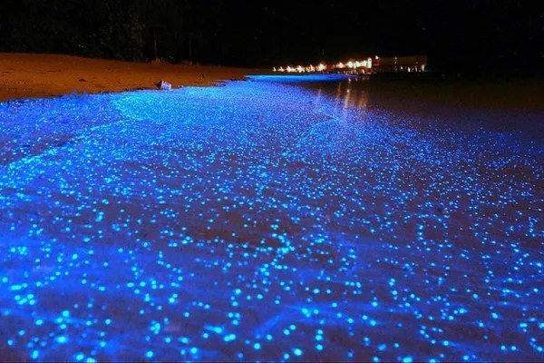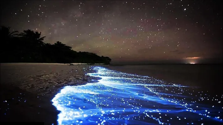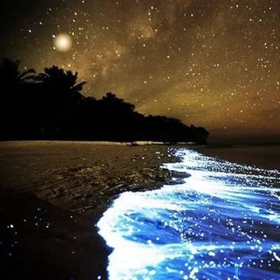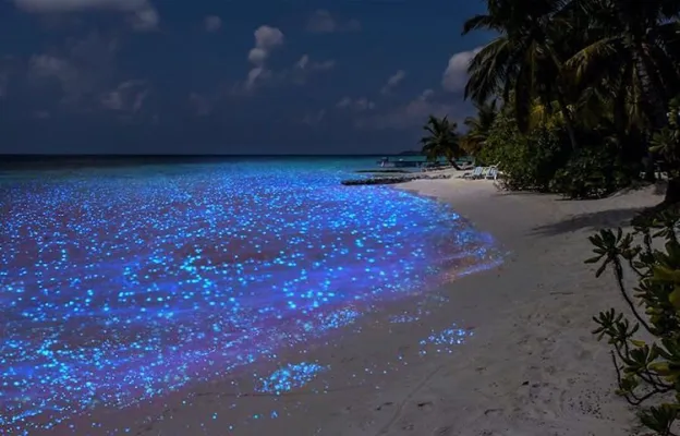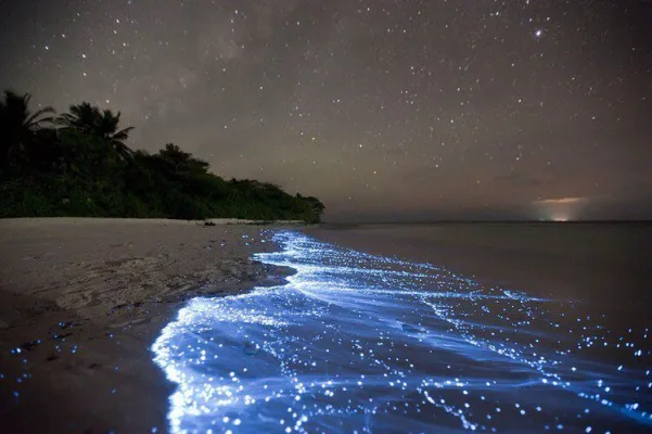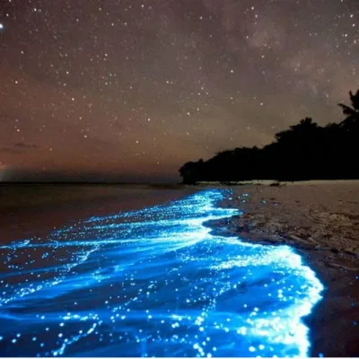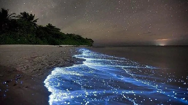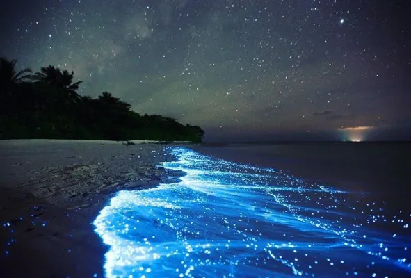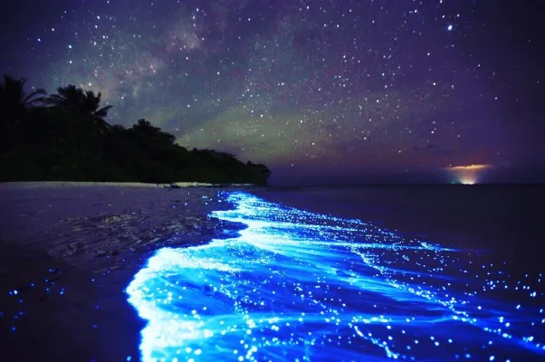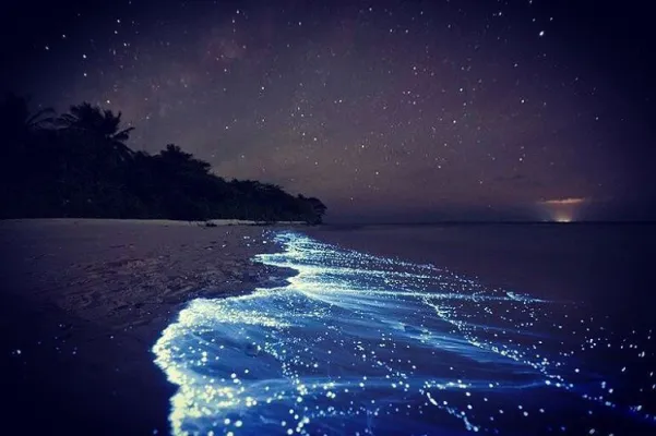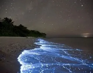 Maldive, atollo di Huvadhu e più precisamente spiaggia di Vaadhoo. Un paradiso reso ancora più incantevole da un fenomeno naturale inconsueto. Di notte, infatti, le acque cristalline di questa spiaggia si illuminano fino a diventare come un cielo stellato. Uno spettacolo straordinario, che deriva dalla bioluminescenza del fitoplancton, particolari microrganismi che vivono in quelle acque marine e che si depositano sulla sabbia, dando l'effetto di migliaia di lucine azzurre. Il fenomeno non si verifica però tutte le notti, ma soprattutto in estate.