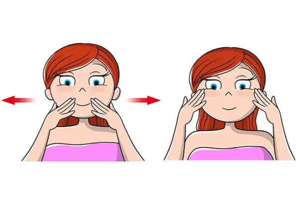 (www.melarossa.it) Accenna il sorriso della Gioconda e appoggia le dita delle mani da ambedue i lati sotto gli zigomi, risali fino agli zigomi e stira verso l'esterno fino ad arrivare alle tempie. Illustrazione: Marcello Carriero