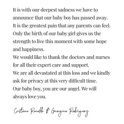Georgina e Ronaldo stanno attraversando un momento buio della loro vita, la tragedia più grande che due genitori possano subire, la perdita di un figlio. La gioia dell’arrivo della quinta bambina è stata improvvisamente spezzata dalla morte, durante il parto, del gemello maschio.