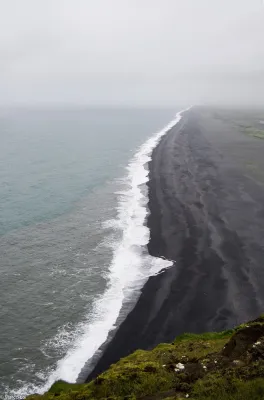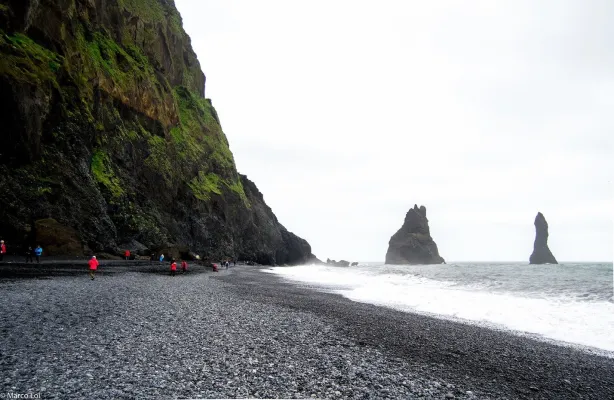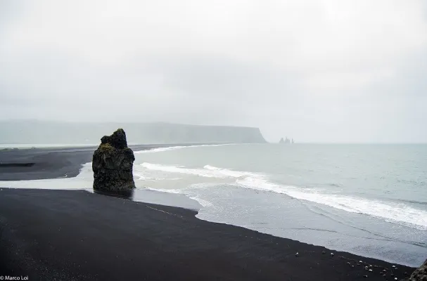 Reynisfjara, spiaggia nera, Vik. Spiaggia vulcanica dominata da faraglioni e da una nera scogliera in basalto colonnare, simile alla Giant's Causeway irlandese.