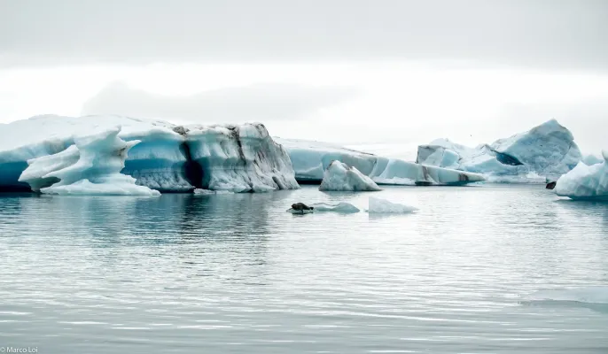 Lago del Ghiacciaio Jokulsarlon; è il più grande e più conosciuto lago di origina glaciale dell'Islanda. Situato a sud del ghiacciaio Vatnajökull, tra il Parco Nazionale Skaftafell e la città di Höfn, Lago del Ghiacciaio Jokulsarlon.