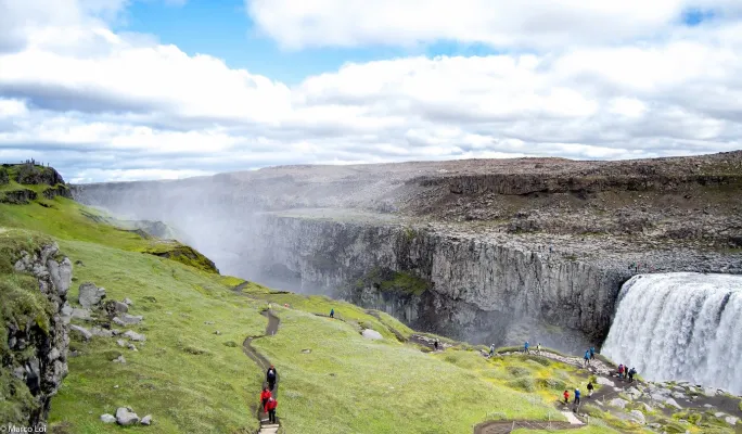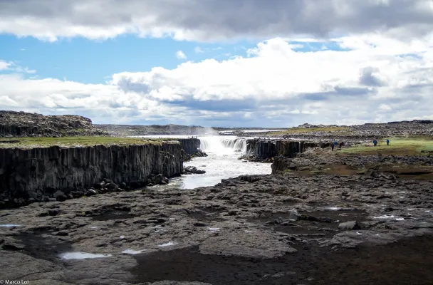 Cascata di Dettifoss. Situata nell'Anello di diamante, protetta dal parco nazionale di Jökulságljufur, Detifoss è la più imponente cascata d'Europa e forse la più impressionante. Ha un'altezza di 45 m ma presenta un fronte di ben 100 m.