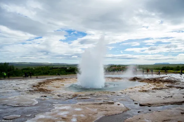 Geyser Strokkur, nella parte sud-ovest del paese, a est di Reykjavik. Si tratta di uno dei più famosi geyser d'Islanda del mondo, in eruzione circa ogni 4 /8 minuti con fiotti da 15/20 m di altezza, talvolta fino a 40 m di altezza.