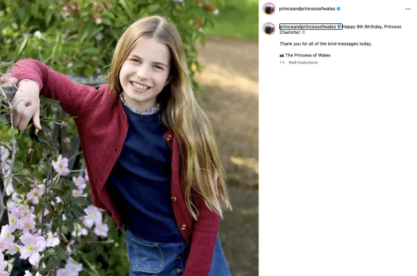 Gonnellina in jeans, maglione bordeaux e sorriso smagliante: eccola la principessina Charlotte nel giorno del suo nono compleanno. Circondata da fiori e affetto, la figlia di Kate Middleton e del principe William appare sull’account social ufficiale dei genitori che come tradizione hanno condiviso lo scatto per festeggiarla e per permettere a tutti i royal fans di farle gli auguri. E infatti il post è stato subito preso d’assalto. A scattare la foto così come era successo qualche settimana fa col piccolo di casa, Louis (leggi qui), è stata proprio Kate Middleton appena qualche giorno fa, come assicurano da Kensington Palace. Nella didascalia si legge: “Buon nono compleanno principessa Charlotte. Grazie per tutti i gentili messaggi di oggi". E non c’è dubbio che l’aria serena e scanzonata della principessina, da anni descritta come la più turbolenta dei tre figli della coppia tanto da meritarsi il soprannome di “warrior princess", principessa guerriera, voglia in tutti i modi tranquillizzare i sudditi di Sua Maestà, da mesi in apprensione per la salute di Kate (leggi qui), che da febbraio si sta sottoponendo a chemioterapia per combattere il tumore che l’ha colpita.