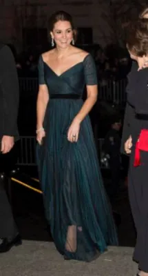 Il lungo abito blu con corpino drappeggiato e gonna plissettata firmato Jenny Packham.