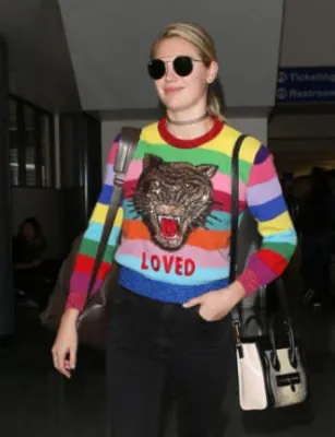 Kate Upton non ha mai nascosto il suo amore incondizionato per gli animali e persino il suo modo di vestire ha a che vedere con la sua vicinanza agli amici a quattro zampe. Ecco infatti la modella, in arrivo a Los Angeles in aereo, con un maglione firmato da Gucci con i colori dell'arcobaleno e con l'effige di una grossa tigre.