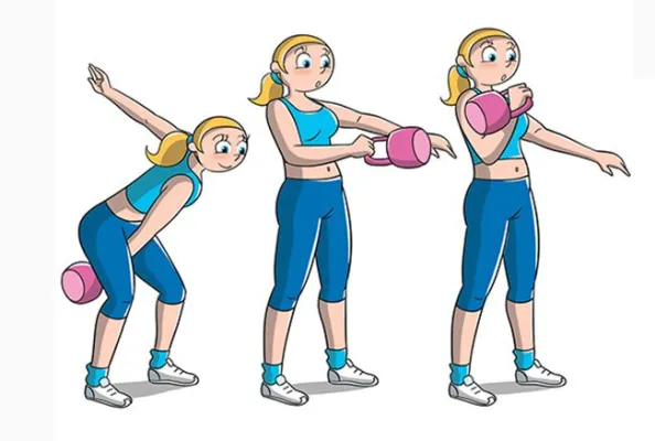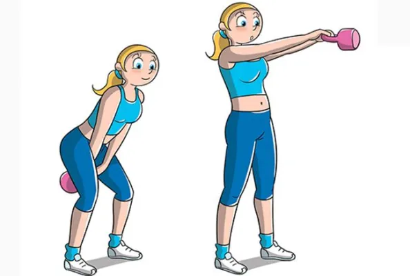 (www.melarossa.it) Swing: Afferra con tutte e due le mani, con una presa prona, un solo kettlebell e tieni i piedi in corrispondenza della larghezza delle spalle. Piega leggermente le ginocchia, spingendo indietro i fianchi e facendo attenzione che la schiena sia sempre dritta. Fai scendere il kettlebell in mezzo alla gambe tenendo sempre le braccia tese. Da questa posizione, che è quella di partenza, spingi il bacino in avanti e contrai i glutei. Con lo slancio di questo movimento, spingi il kettlebell in avanti fino ad arrivare all?altezza delle spalle. Devi quindi sfruttare il movimento del tuo corpo, senza che i muscoli del braccio fatichino per spingere l?attrezzo. Infine torna nella posizione iniziale. Illustrazioni: Marcello Carriero