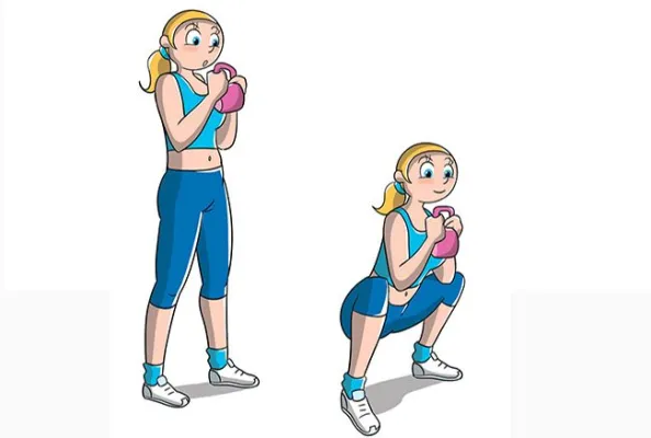 (www.melarossa.it) Front Squat: Questo esercizio può essere eseguito utilizzando un solo kettlebell, afferrato con tutte e due le mani, o per i più allenati anche con due kettlebell. Inizia da una posizione eretta, con le gambe larghe all?altezza delle spalle e le punte leggermente divaricate. Dopo aver afferrato il kettlebell, facendo attenzione a mantenere la schiena dritta, portalo al petto. Inizia a scendere con le gambe, spingendo indietro i glutei e facendo attenzione che il ginocchio non superi la linea della punta del piede. Il peso del corpo infatti dovrà gravare sui talloni e non sulle punte. Insomma, il classico movimento degli squat. Infine torna in posizione eretta facendo forza sui muscoli della coscia. Fondamentale, nel corso dell?esercizio, tenere contratti gli addominali e i muscoli della schiena. Illustrazioni: Marcello Carriero