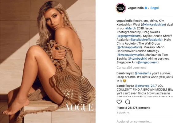 La regola del "basta che se ne parli" nel caso di Kim Kardashian è un diktat a livello globale. Che non risparmia nemmeno la lontana India. Già perché è bastato che la star americana, "famosa per essere famosa", finisse sulla copertina di Vogue India (su Instangram @vogueindia) perché si sollevasse un vespaio di proteste e polemiche. Diversi lettori delle rivista che ha condiviso su Instangram gli scatti con la Kardashian, infatti, si sono lamentati sui social perché per la copertina non è stata scelta una donna rappresentativa della cultura indiana.