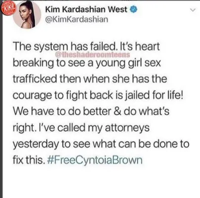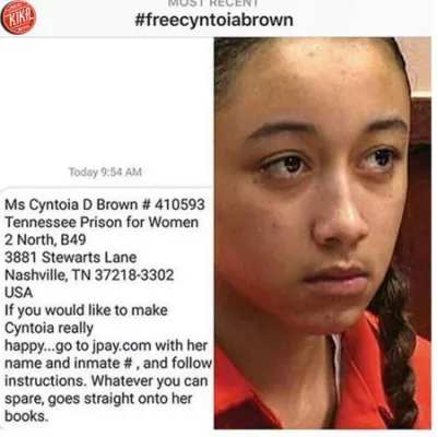 Negli Stati Uniti la mobilitazione social #freecyntoiabrown ha coinvolto sempre più persone e Kim Kardashian dal suo profilo Instagram ha tuonato: "Il sistema ha fallito. Fa male al cuore vedere una ragazzina oggetto di un traffico a sfondo sessuale che quando ha il coraggio di lottare per se stessa viene imprigionata. Dobbiamo fare di meglio e fare quello che è giusto. Ho dato mandato ai miei avvocati ieri per verificare cosa si può fare. #freecyntoiabrown". E anche Rihanna e Cara Delevingne hanno fatto sentire le loro voci "social".