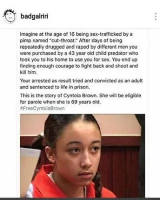 Cyntoia Brown è una giovane donna del Tennesse, condannata all'ergastolo per l'omicidio di un uomo che l'aveva "comprata" come sua schiava sessuale quando aveva solo 16 anni. Per molti americani e per queste tre celebrity in prima linea, un sistema che non tiene conto delle contingenze e delle modalità della vicenda ha fallito.