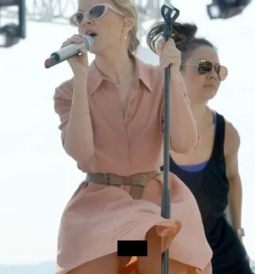 La popstar australiana tradita da un colpo di vento a Cannes. Il siparietto sex è involontario, ma la cantante replica esibendo il suo decollete durante la passeggiata sulla Croisette.