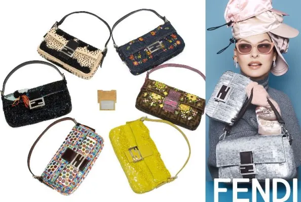 La piccola borsa-icona con il nome del croccante pane francese fu creata nel 1997 da Silvia Venturini Fendi. Un modello che ha fatto la storia della moda ed è amatissimo anche oggi. A 25 dalla sua nascita la maison la celebra con una campagna guidata da Linda Evangelista. Foto Ansa e Instagram