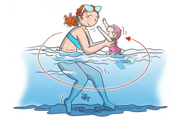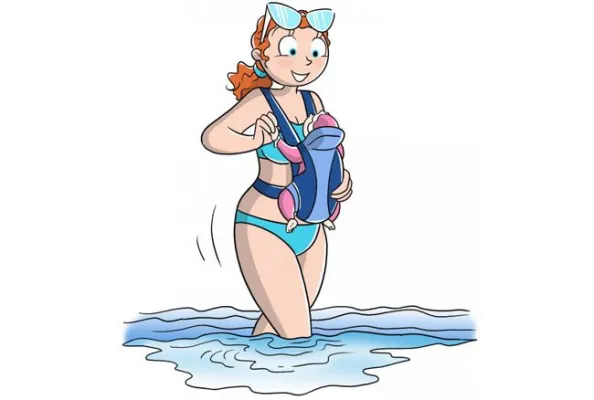 Metti il bimbo nel marsupio e fai 20- 30 minuti di camminata nell'acqua, che deve arrivare più o meno all'altezza della coscia, per migliorare la circolazione e perdere qualche caloria. Illustrazione: Marcello Carriero