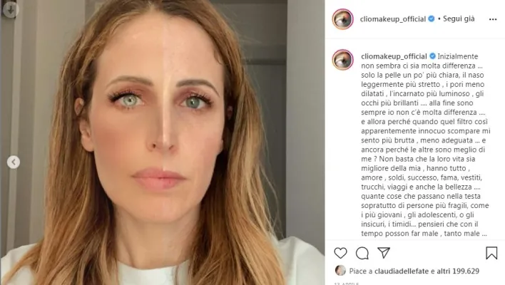 Recentemente Clio Make up si è mostrata senza filtri e ha spiegato come l’abuso di questi strumenti, che rendono i visi perfetti, possa indurre le ragazze più fragili a non accettarsi con il loro viso reale.