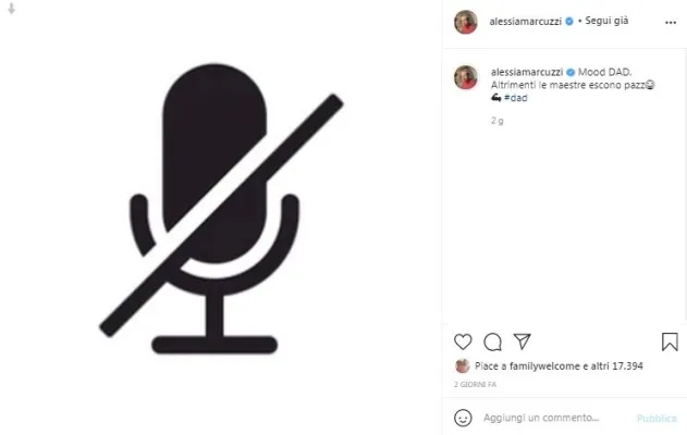 Un microfono nero silenziato su uno sfondo bianco è quello con cui tanti genitori hanno imparato a prendere dimestichezza quando i figli si ritrovano di fronte al computer per la loro lezione di scuola. “Mood DAD. Altrimenti le maestre escono pazze”, ha scritto la conduttrice su Instagram. Aggiungendo una faccina sorridente e una emoticon che comunica forza e solidarietà. Il post è ispirato a un momento tipico delle lezioni da remoto: accendere e spegnere i microfoni per non creare confusione, pensando agli insegnanti che devono gestire una classe intera attraverso uno schermo. Un post che ha collezionato oltre 10mila like in un’ora e tanti commenti di genitori che vivono la stessa difficile condizione.