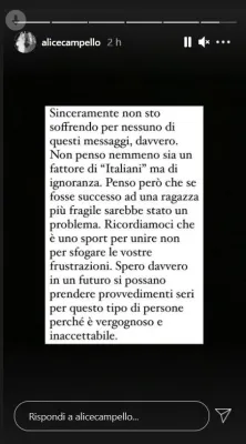 "Sinceramente non sto soffrendo per nessuno di questi messaggi, davvero. Non penso nemmeno sia un fattore di 'Italiani' ma di ignoranza": così la moglie di Alvaro Morata, Alice Campello, denuncia su Instagram nuovi messaggi offensivi e spregevoli contro la sua famiglia.