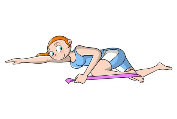 (www.melarossa.it) Rinforzare i muscoli della coscia con l'elastico fitness: Disteso sul fianco destro, braccio teso (o piegato) sotto la testa, gamba destra leggermente piegata, spalle e fianchi allineati, l'elastico sotto il piede sinistro e le 2 estremità dell'elastico nella mano destra. Espira e distendi la gamba sinistra. Poi riporta la gamba verso l'alto senza muovere né il bacino né la schiena. Illustrazione: Marcello Carriero.