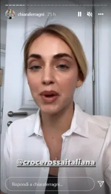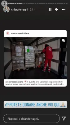Su Instagram Ferragni posta un video dicendo che si è chiesta in questi giorni a quale organizzazione o ente umanitario rivolgersi per supportare al meglio la popolazione colpita dall'emergenza, e spiega alla fine di aver deciso per la Croce Rossa che fin dal primo momento si è attivata e continuerà a farlo anche nelle prossime settimane. Quindi l'influencer invita tutti i suoi follower a fare come lei, anche con un piccolissimo contributo.