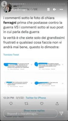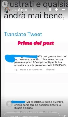 Da notare che, prima del suo post sulla Croce Rossa, le arrivavano giudizi sprezzanti sulla sua vita dorata e sul fatto che continuasse a esibirla pure in un momento in cui in Ucraina si scatena la brutalità dell’invasione russa. Dopo il suo appello a donare, sono invece partite bordate all’insegna del “non abbiamo bisogno dei tuoi suggerimenti, ci innervosisci”. Esausta per questi atteggiamenti, Ferragni ha postato fra le sue storie l’intervento di una commentatrice più equilibrata: “La verità è che siete solo dei grandissimi frustrati e qualsiasi cosa faccia non vi andrà mai bene”.