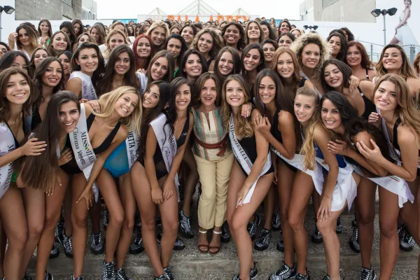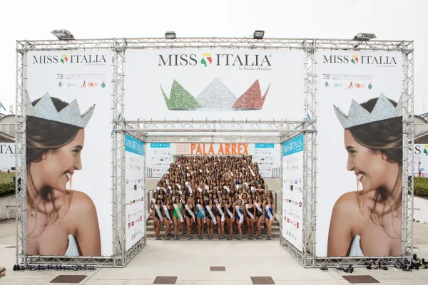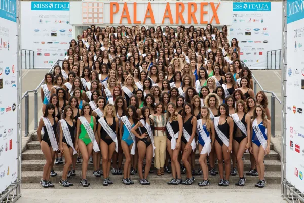 È il quinto anno che la ormai celebre scalinata del Pala Arrex accoglie le miss, quest'anno ben 214, e la sua patron Patrizia Mirigliani. Un bellissimo gruppo, un rituale che ha fatto felici le ragazze e tutta Miss Italia.