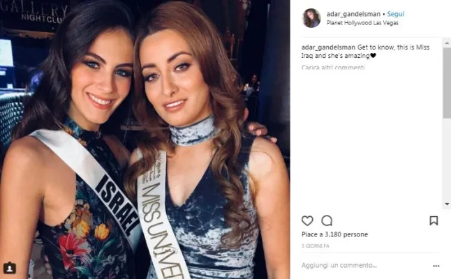 Un semplice selfie tra Miss è diventato un caso diplomatico. In occasione del concorso Miss Universo a Las Vegas, Miss Iraq, Sarah Eedan, prima reginetta di bellezza a rappresentare il proprio Paese a Miss Universo da 45 anni, e Adar Gandelsman, Miss Israele, hanno posato insieme per un selfie. La foto è stata condivisa dalla finalista israeliana sul proprio profilo Instagram e immediate e contrastanti sono state le reazioni della rete.