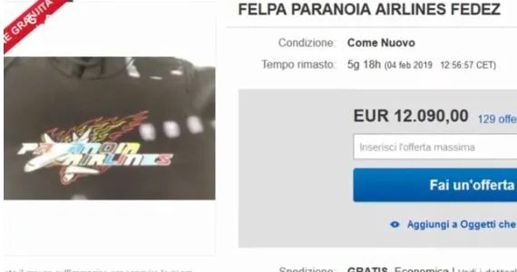 A Fedez e Chiara Ferragni era sembrata un’idea carina quella di accompagnare l’ultimo disco del rapper con una felpa-omaggio, non pensavano che il gadget sarebbe diventato oggetto di culto e di un’asta su Ebay. Le felpe della capsule collection “design by The Ferragnez” sono infatti arrivate a costare fino a 12.800 euro sul popolare sito di aste on line nonostante fossero gratis: un omaggio che Fedez ha voluto fare ai fan che acquistavano il suo nuovo disco Paranoia Airlines, assieme ad altri prodotti di Diesel come magliette, cappellini e tazze, tutti in edizione limitata.