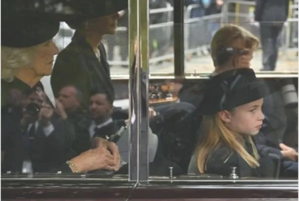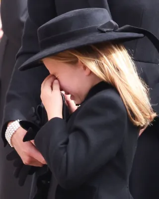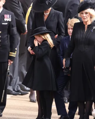 George e Charlotte hanno anche accompagnato a piedi il feretro, almeno per un po', non per l'intera processione, troppo lunga, troppo stancante, troppo stressante. Nulla a che vedere con l'immagine del principe Harry 12enne che camminava a capo chino dietro la bara della mamma Diana. La piccola Charlotte ha ceduto alle lacrime in un solo momento: quando la bara della regina è stata calata nel carro funebre subito confortata dalla madre Kate Middleton.