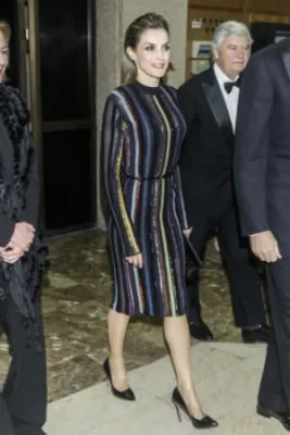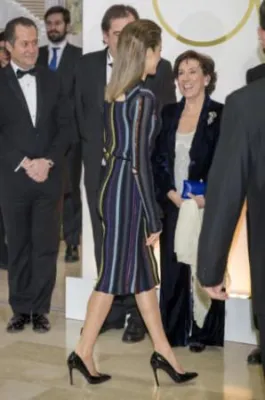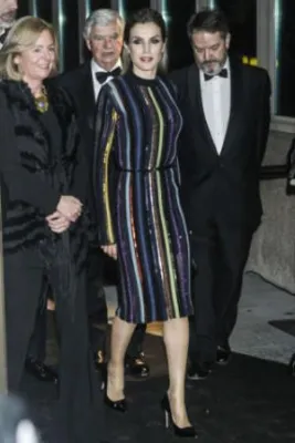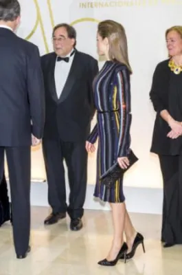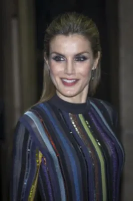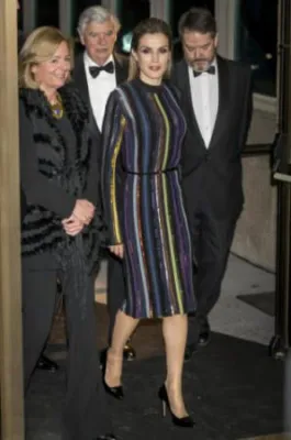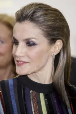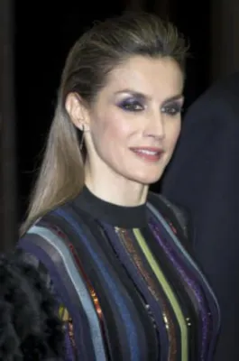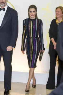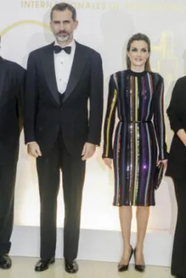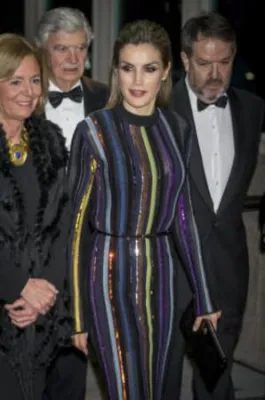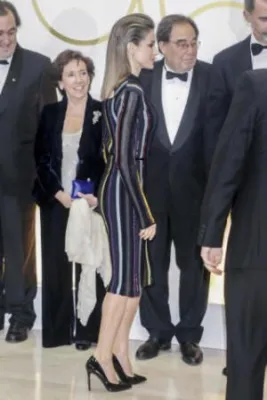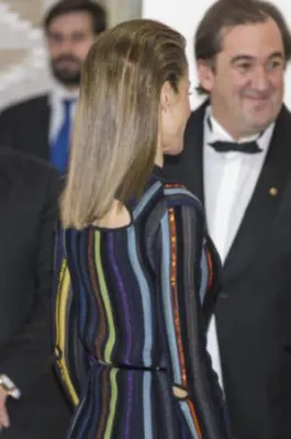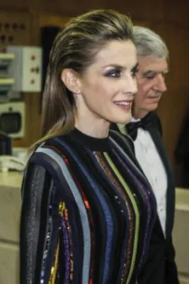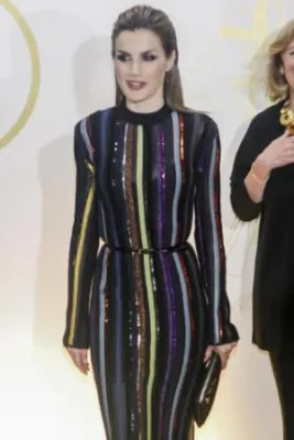 Quando l'allora principe, oggi re, Felipe di Borbone sposò la giornalista televisiva Letizia Ortiz, i riflettori di tutto il mondo si accesero sulla corona di Spagna, dove per la prima volta un erede al trono sposava una donna di origine borghese destinata a diventare regina. Da allora la principessa ha sempre mantenuto un certo savoir faire che l'ha fatta ben volere dal popolo: una sovrana sobria che però non ha il timore di mostrarsi molto sexy. Come in queste foto scattate alla cena del premio giornalistico Mariano de Cavia - Luca de Tena - Mingote, che si è tenuta nella sede ABC di Madrid. La regina ha indossato un abito a righe verticali colorate su sfondo nero molto trasparente sul seno, così tanto da mostrare l'intimo sottostante. Per completare il look piuttosto aggressivo, Letizia Ortiz ha scelto un make up molto scuro, capelli all'indietro e una borsa con borchie.